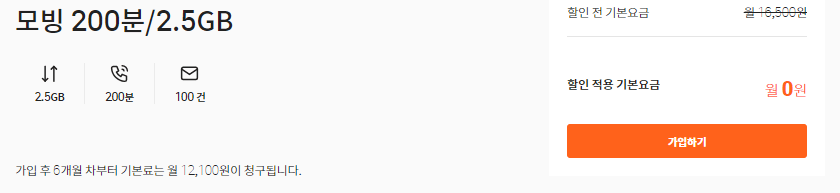 모빙 200분은 가입 후 6개월 0원으로 사용가능하며 6개월 후부터 월 121,00원 청구됩니다.