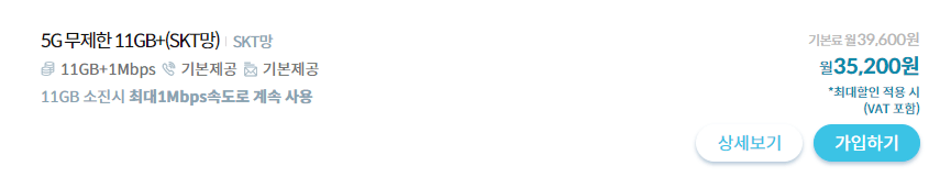 5G를 무제한으로 이용 시 39,600원 청구되며 할인적용 시 35,200원으로 이용 가능합니다.