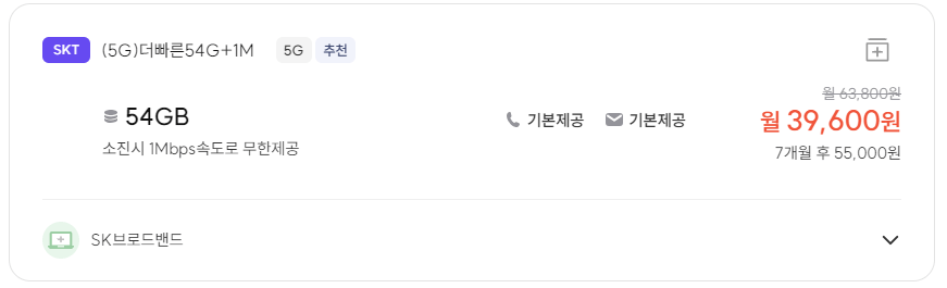54GB는 월 39,600원으로 사용가능하며 7개월 후부터 55,000원 청구됩니다.